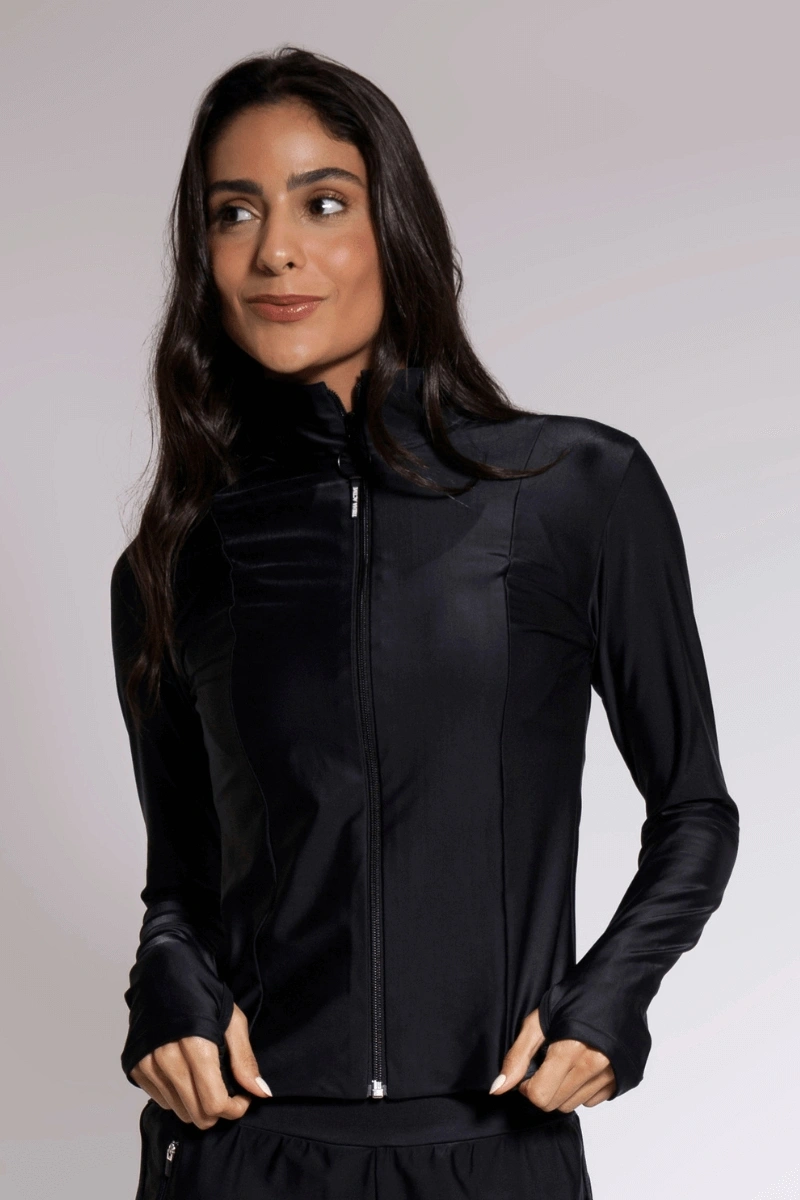 Casaco em modelagem que se adapta perfeitamente ao corpo feminino, com zíper frontal, gola e abertura para o polegar.
