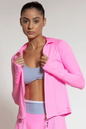 Casaco em modelagem que se adapta perfeitamente ao corpo feminino, com gola, zíper frontal e abertura para polegar.