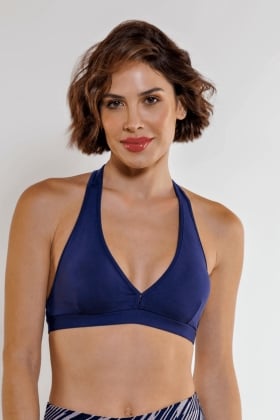 Top com decote em V e bojo removível. Costas abertas com tira central.